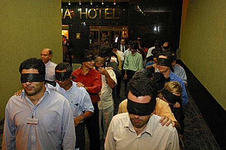 ...Ao contrário do que a maioria pensou, os convidados vendados formaram duas filas e começaram a ser conduzidos para fora do Bristol Jandaia Hotel...